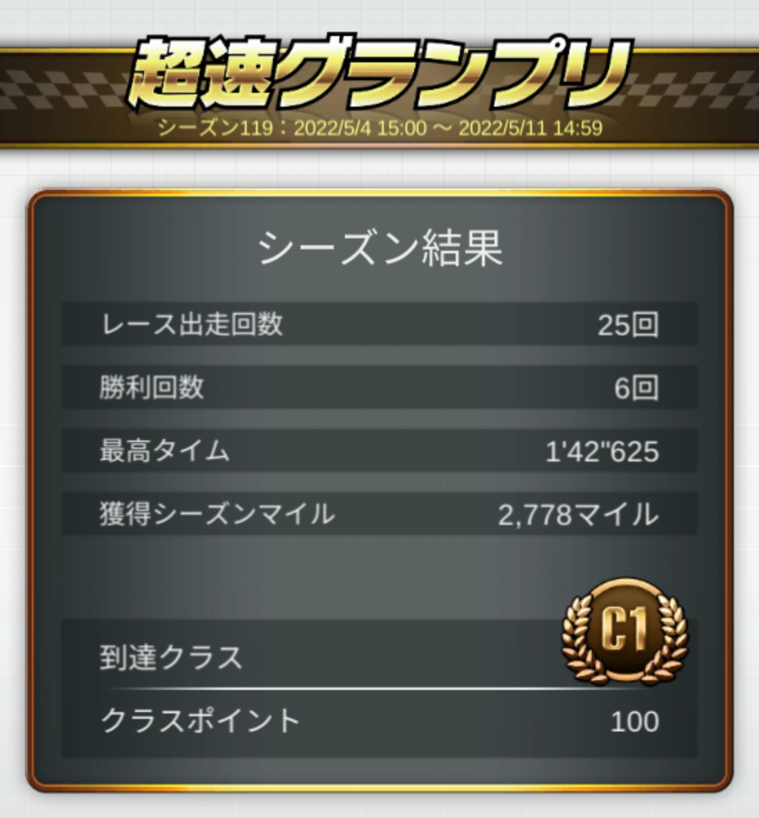 勝利回数については6回。勝てて良かった……。正直周回遅れリタイアもあったんですよね。あれを食らうと厳しいのよ。